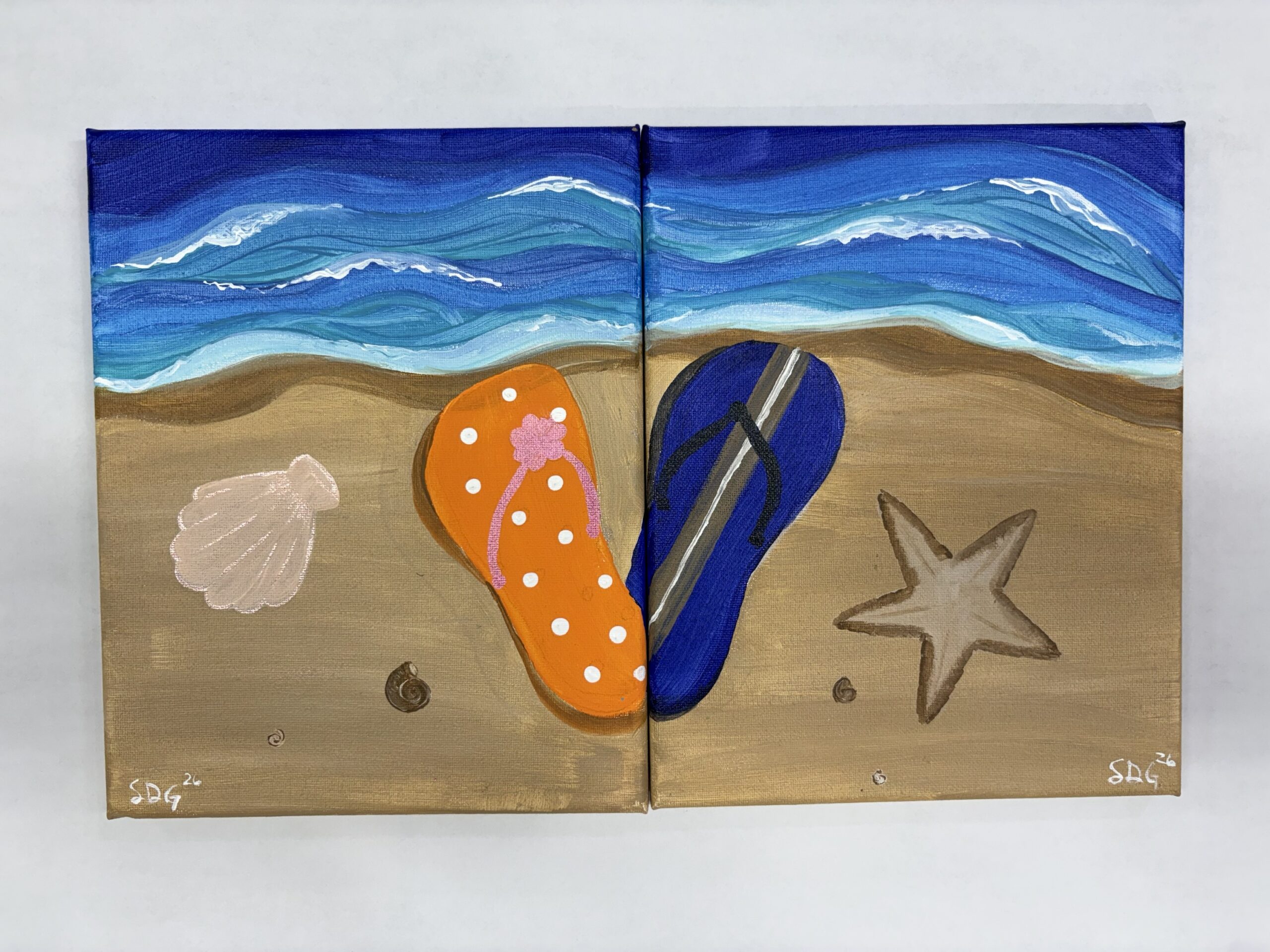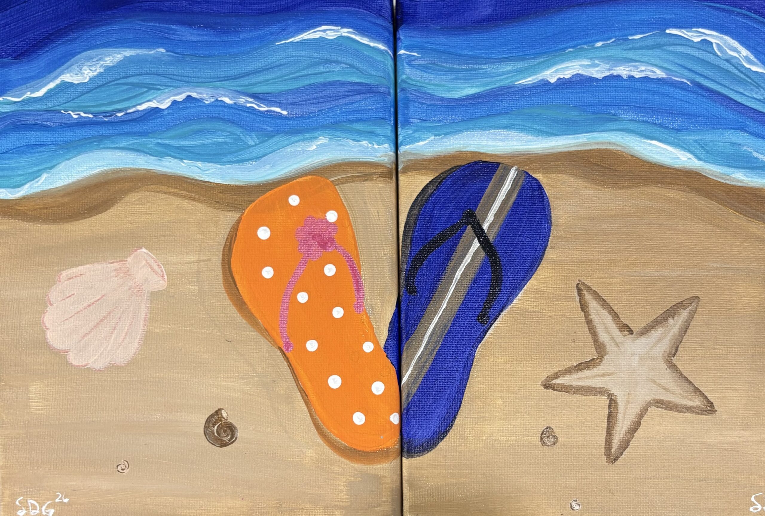 Our beach sandals painting is a fun, cute way to paint something together! each person paints this beach scene and adds embellishments to the their sandal that represent them. The sandals come together in the shape of a heart. Come try it!